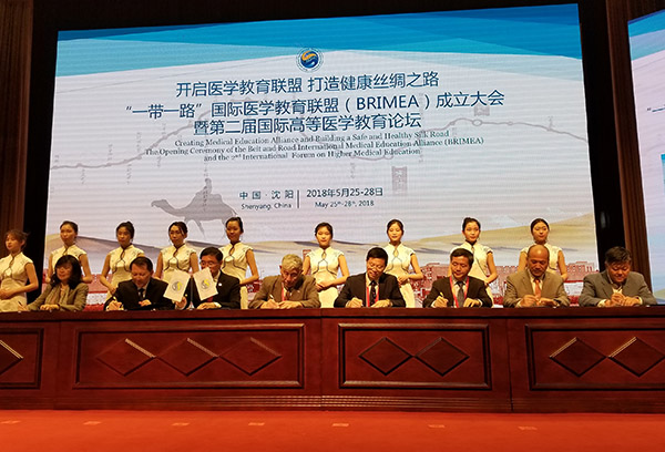 5月26日至28日,“一带一路”国际医学教育联盟 (BRIMEA)成立大会暨第二届国际高等医学教育论坛在沈阳中国医科大学召开。我校被推选为“一带一路”国际医学教育联盟副理事长单位,校党委副书记刘群英出席此次大会并签署了合作框架协议。
