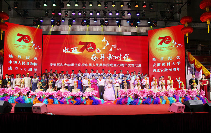 整场晚会共14个节目,高潮迭起,展示了我校师生丰富多彩的文艺生活和积极向上的精神风貌。老师和学生们用自己的实际行动向新中国70岁生日献上了最诚挚、最美好的祝福,表达了我校广大师生不忘初心、牢记使命,以永不懈怠的精神状态和一往无前的奋斗姿态,为早日建成高水平医科大学而努力奋斗的决心。(新闻中心)