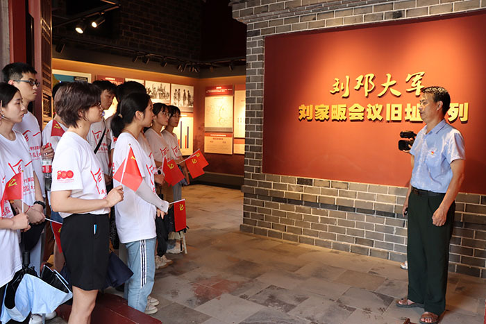 实践队员在刘邓大军高干会议旧址聆听讲解员讲述革命历史