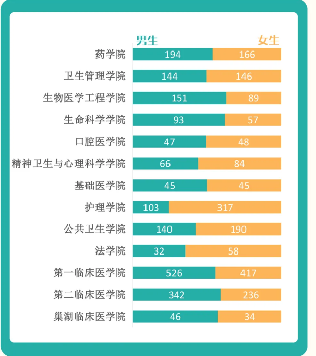 据介绍,该校今年共录取3816名2021级本科新生。在新生中,女生人数为1887名 ,男生人数为1929名。各学院中男女比例差距最大的是护理学院,男生人数为103名,而女生由317名。 学院中男女比例差距最小的是基础医学院,男生和女生人数相同。