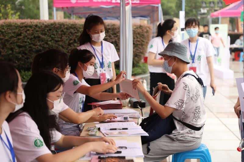 新生到校后,身穿统一服装、佩戴红色胸牌的志愿者们在北门、图书馆门口、青年志愿者岗亭等处提供托运行李、报到指导、问题解答等服务。