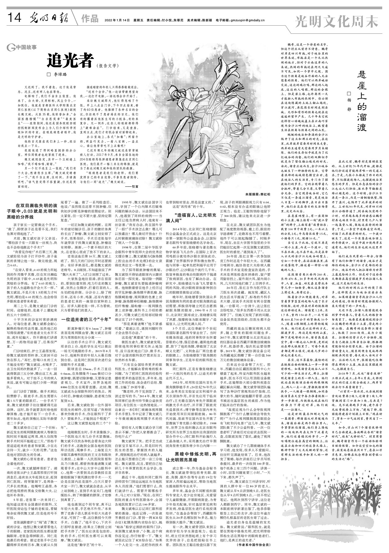 追光者自身也是温暖的发光体。魏文斌常说:“眼科医生,就是要在黑暗中修炼光明,把光明带给那些生活在黑暗中的眼病患者们。他们,是真正的追光者。”
