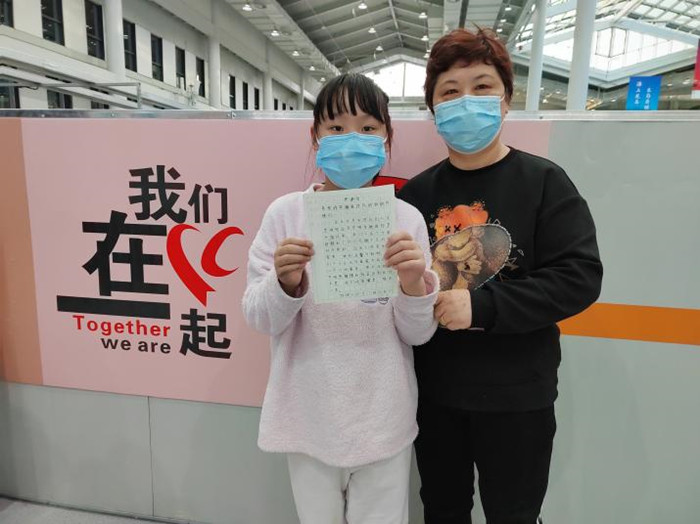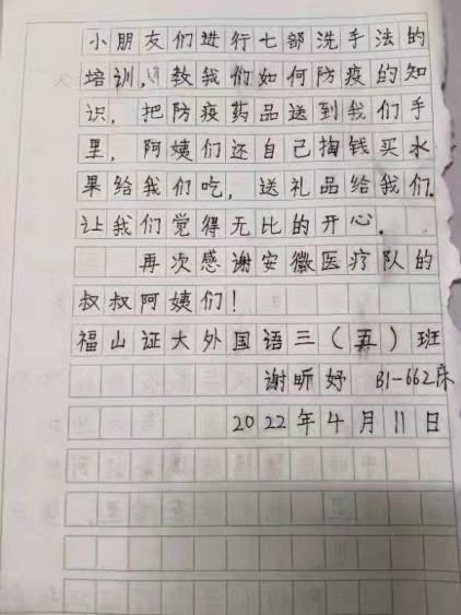 4月11日下午,在上海崇明区复兴舱B区舱内,我收到了这样一封特别来信。“千言万语汇成一句‘感激、感恩’,感谢所有奋战在一线的抗疫人员,有你们真好!”这是一位九岁小朋友在奶奶的指导下所写的,之后亲自交给了我。