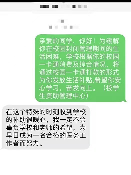“亲爱的同学,你好!为缓解你在校园封闭管理期间的生活困难,学校根据你的校园一卡通消费及综合情况,通过校园一卡通打卡的形式为你发放生活补贴……”