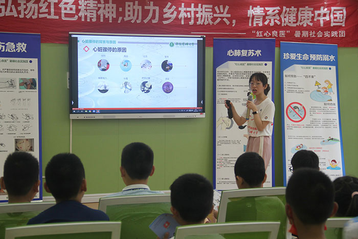 该校还有很多团队走进乡村中心小学、少年宫活动中心及社区活动场所向儿童开展防溺水教育。“医路溯源”暑期实践团针对适龄儿童制作“暑期安全小贴士手册”,并和小朋友们一起创作了防溺水黑板报;“情系乡村 医路红途”社会实践团将事故预防与应对相结合,为小朋友开展防溺水知识宣讲,为学生家长演示了海姆立克急救法。
