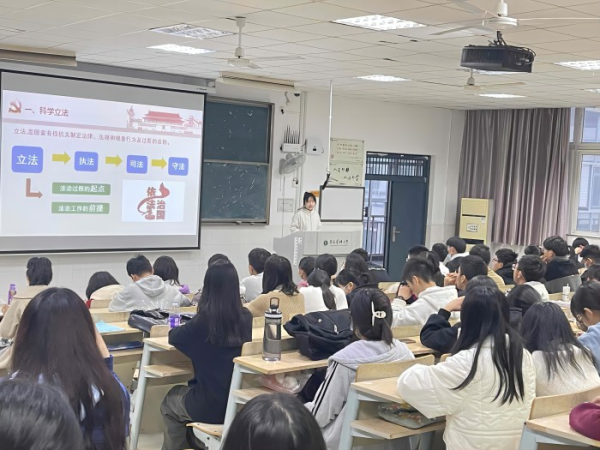 “同学们请看,这张照片是云南省贡山县人民法院法官邓兴背着国徽与同事们跨过怒江时的场景。为了方便居住在高山峡谷里的农村群众,他和同事们每年足迹遍及50多个村镇,行程近万公里,组建巡回法庭为村民提供法律服务......”11月20日,新成立的习近平法治思想宣讲团开展了首场宣讲,团队成员吴蒙同学紧扣党的二十大报告中“坚持全面依法治国,推进法治中国建设”的内容,正结合精心制作的幻灯片以及搜集的法治故事,向同学们阐述近年来国家在推进公正司法中取得的重要进展。