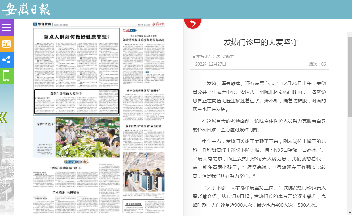 “发热、浑身酸痛、还有点恶心……”12月26日上午,安徽省公共卫生临床中心、安医大一附院北区发热门诊内,一名就诊患者正在向值班医生描述着症状。殊不知,隔着防护服,对面的医生也正在发烧。