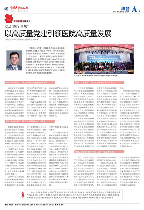 医院党委贯彻落实学校党委“附属医院‘既是医院、也是学院、还是研究院’”三位一体目标定位,深化落实“院院合一”改革,全面提高医院核心科技竞争力。通过举办“科技周”系列活动、青年医师临床技能竞赛、“弘德善医大讲堂”,邀请全国卫生健康领域知名专家授课,着力点燃职工的科研热情。医院已连续11年入围中国最佳医院百强榜。在最新公布的《2021年中国医院科技量值排名》中,医院在全国综合排名第67位,有29个学科进入全国100强,学科综合排名位居安徽省第一。