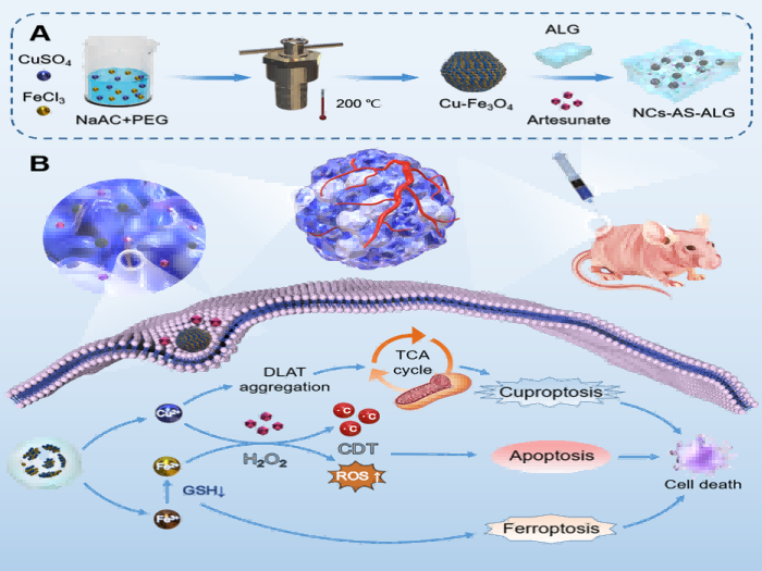 使用金属纳米酶的化学动力疗法为治疗深部肿瘤带来新的机遇,然而,较低的ROS催化率和对高浓度H2O2的依赖影响了疗效。为解决这一问题,研究人员将 Cu-Fe3O4纳米酶(NCs)、青蒿琥酯(AS)与海藻酸钠(ALG)通过钙离子原位包封在一起,构建了一种用于治疗骨肉瘤的水凝胶NCs-AS-ALG。这种水凝胶可在肿瘤组织内长时间释放纳米粒子和青蒿琥酯,利用NCs的多酶活性实现活性氧积累。铁离子、铜离子与青蒿琥酯相互作用产生的碳自由基(·C)会放大氧化应激,导致肿瘤细胞损伤。同时,Cu-Fe3O4纳米酶通过GPX4途径消耗GSH激活铁死亡,并通过DLAT途径导致细胞内铜超载激活铁死亡,从而提高肿瘤杀伤效率。体外实验证实,NCs-AS-ALG水凝胶对肿瘤细胞有很好的杀伤作用;体内实验结果表明,其能有效消除肿瘤,并且具有良好的生物相容性,为骨肉瘤的治疗提供了一种新方法。