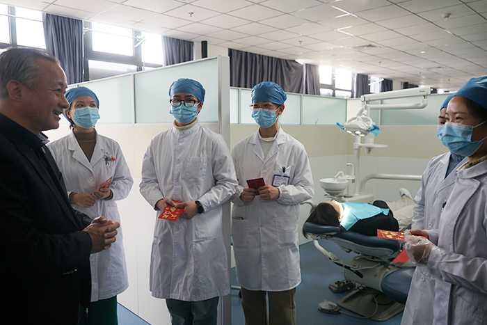 2月5日下午,时值农历蛇年春节后的首个工作日,校长翁建平先后前往学校第一附属医院、第二附属医院和附属口腔医院,看望慰问一线医护人员,向其致以新春的问候和美好的祝福。校党委副书记、一附院党委书记徐朝阳陪同慰问。