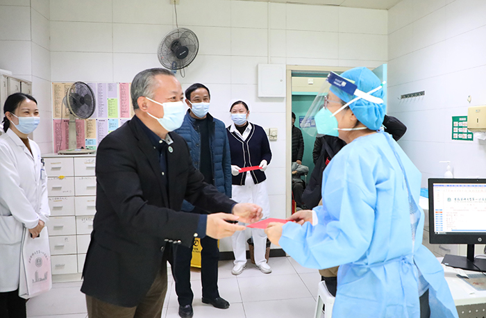 在各个直属附院,翁建平先后走访了门诊服务台、挂号窗口、药房、分诊台、诊室等区域。“感谢你们坚守岗位,护佑群众生命健康!”“祝大家新春快乐,阖家幸福,顺顺利利!”每到一处,他与医务工作者们亲切交谈,详细询问春节期间门诊就诊情况和员工工作状态,代表学校对春节期间坚守岗位、敬业奉献的广大医护职工表示感谢,并送上新春红包,表达美好祝愿。他还向前来就诊的群众表示问候,祝愿早日康复。
