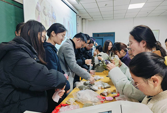 为深化中医药文化体验,学院推出“中药香囊”“艾草养生锤”手工制作活动。学生通过参与研磨香料、混合配方、填充香囊等实践环节,直观感受传统文化魅力和草本药性的养心功效。此外,“八段锦身心共鸣之旅”教学吸引众多参与者,学生在传统功法的一招一式中学习呼吸吐纳技巧,体悟身心和谐之道。
