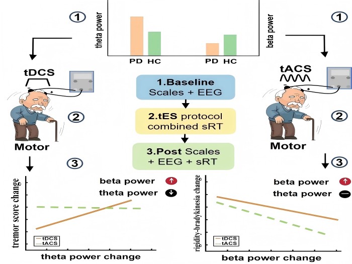 帕金森病(Parkinson's disease,以下简称“PD)是一种以异常神经振荡为典型特征的神经退行性病变,常表现出震颤、僵直、迟缓等运动功能障碍。经颅直流电刺激(tDCS)和经颅交流电刺激(tACS),作为无创神经调控主流技术之一,在改善PD症状方面都显示出一定的临床潜力,但尚不清楚两种方法是否通过一致的神经振荡机制来调控PD的运动症状。