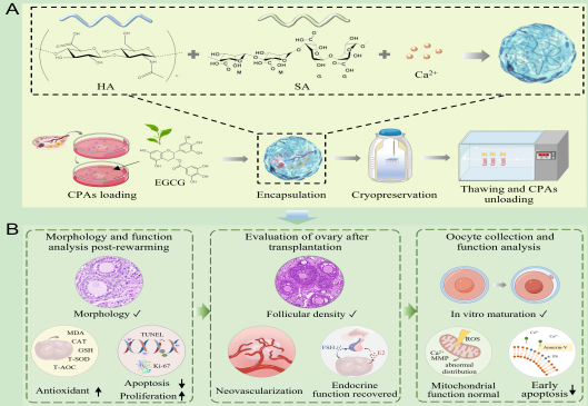 针对上述问题,该项研究提出了一种新型低温保护剂配方结合水凝胶封装的新策略。研究团队深入研究了这一新策略在低温保存过程中对卵巢组织力学性能、抗氧化能力、卵母细胞形态、线粒体功能以及发育潜能的影响,发现了表没食子儿茶素没食子酸酯(EGCG)在卵巢低温保存中的最佳作用浓度,提高了小鼠卵巢的冷冻保存效果。