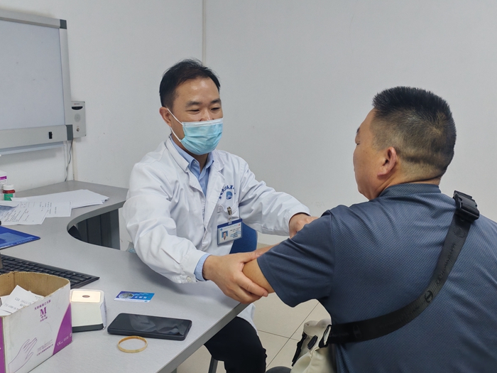 该院关节外科副主任徐俊杰耐心地给患者问诊、查体。 陈媛媛/摄
