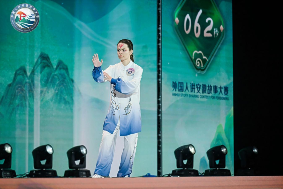 国际学生章伯涵在安徽省第二届外国人讲安徽故事大赛中表演太极拳。