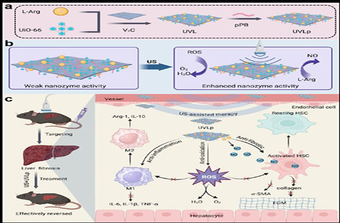 该项研究创新性地构建了一种超声响应型双纳米酶平台(UVLp),首次将超声激活、双纳米酶催化、靶向递送及一氧化氮(NO)治疗策略高效集成,成功实现了对肝纤维化进程中活性氧(ROS)清除与细胞外基质(ECM)重塑的协同干预,为这一临床难治性疾病的防治提供了极具前景的新思路和新方法。