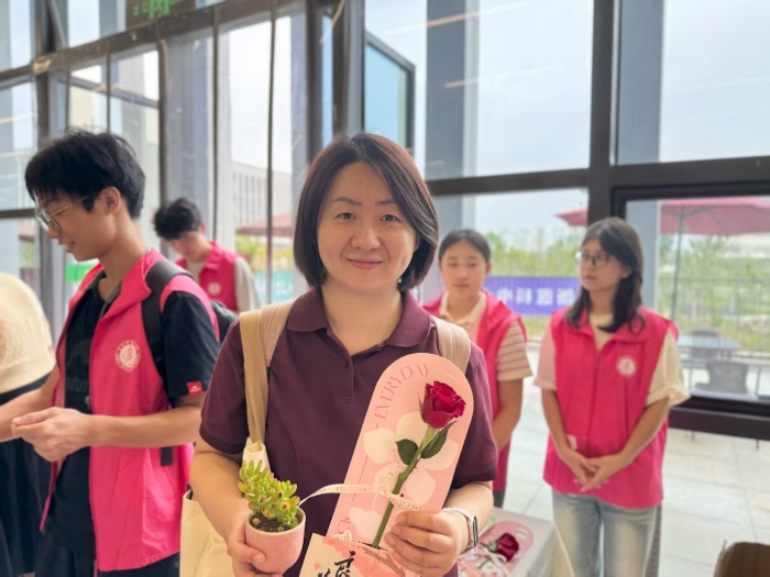在教室,教师收到同学们准备的小心意——一张新校区主题明信片,明信片背面是美好祝福:“老师,您辛苦了,教师节快乐!”食堂门口,学生志愿者为前来用餐的每一位教师送上精心设计的节日贺卡和鲜艳的玫瑰,一声声老师,过节好”,是他们真诚的问候。
