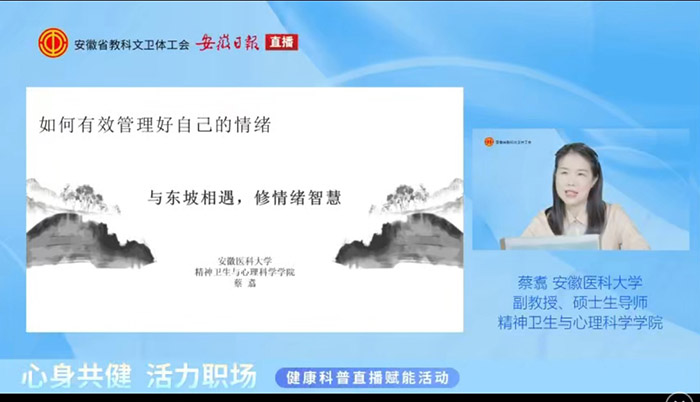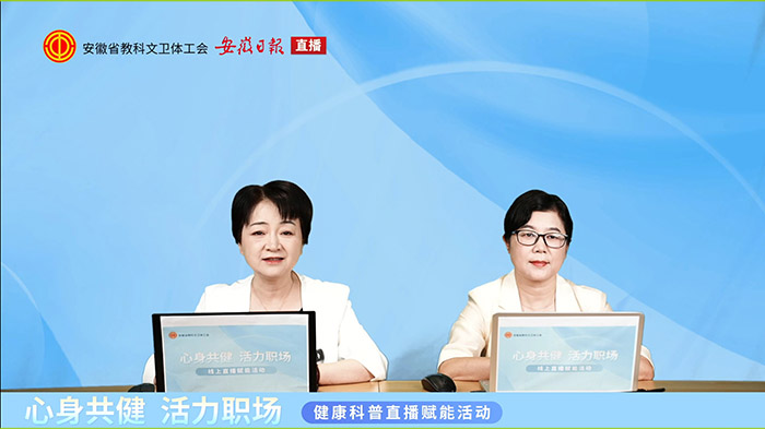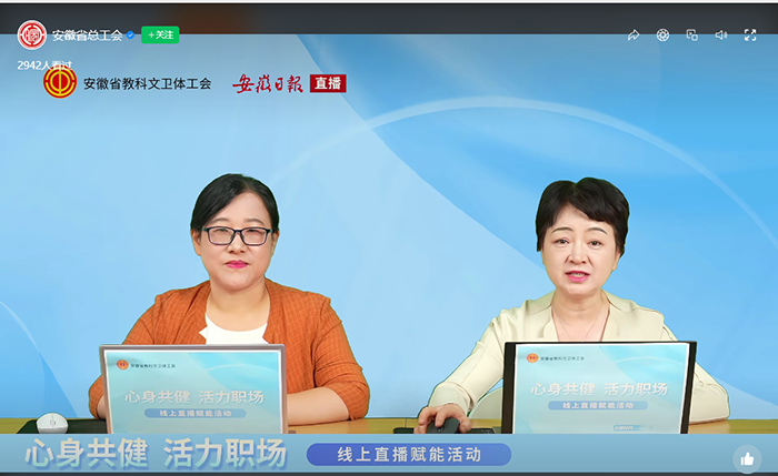 9月12日至19日,校工会受安徽省教科文卫体工会委托,承办省教科文卫体工会“心身共健 活力职场”线上直播活动2场,以切实守护职工身心健康,助力职工以更饱满的状态投入工作与生活。活动累计吸引全省教科文卫体系统职工超6万人次在线参与,为全省职工送上专业、实用的健康“大礼包”,收获广泛好评。​